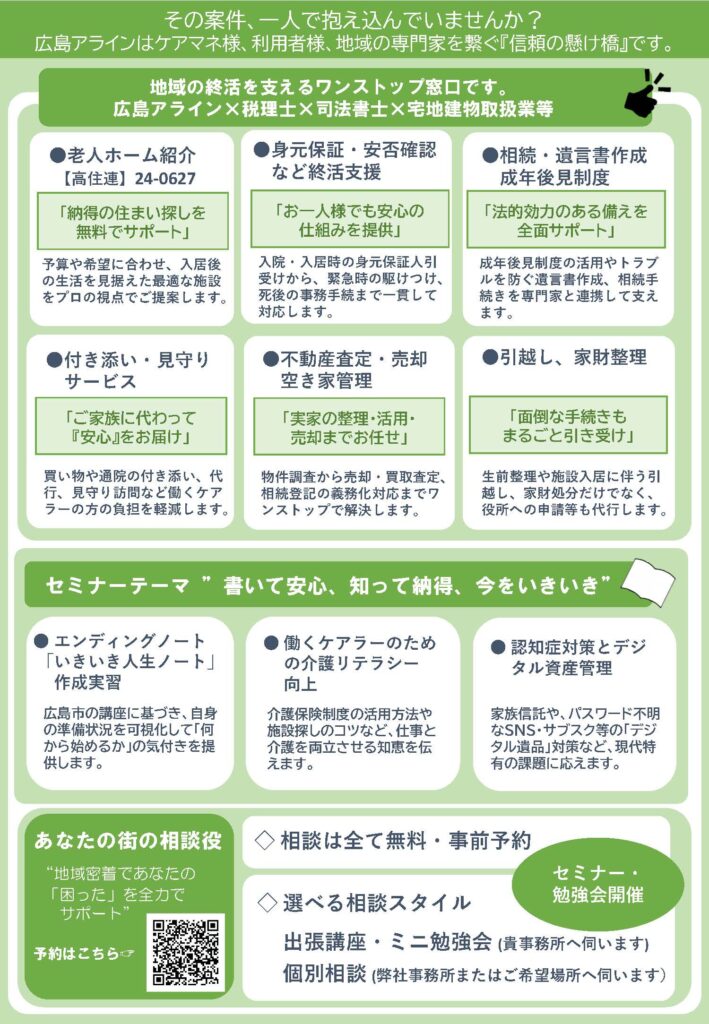 広島市発行エンディングノート「いきいき人生ノート」を活用し、地域の皆さまが具体的な行動に踏み出せる終活をサポートします。